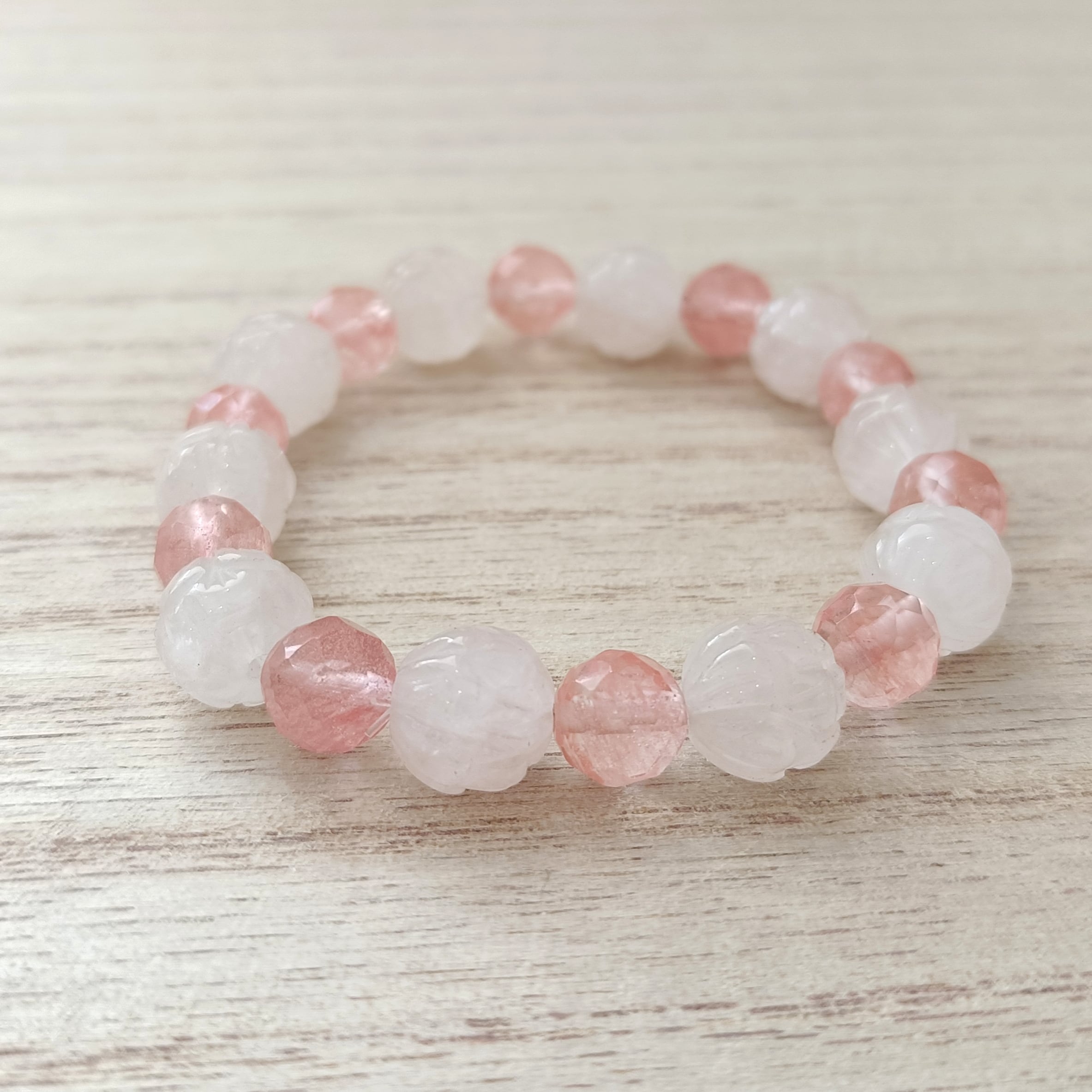 ・愛情運と恋愛運の向上:ローズクォーツの優しい愛のエネルギーと、チェリークォーツの明るさが調和し、恋愛や良縁を引き寄せるといわれている。
