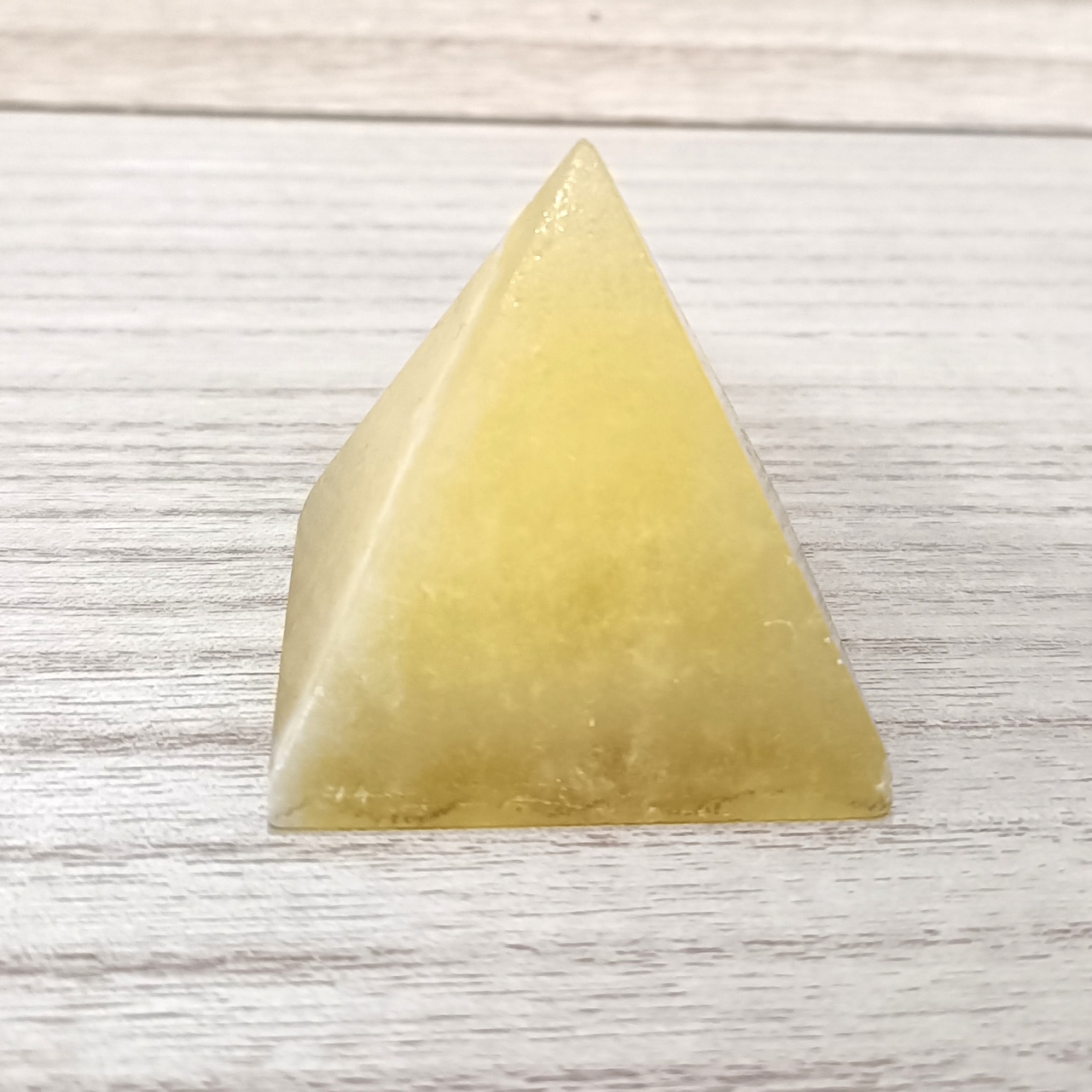 やさしいイエローカラーが印象的な、アラゴナイトのピラミッド型オブジェです。